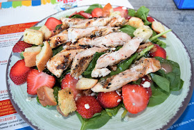 Baby spinach greens, candied pecans, sliced strawberries, cucumbers, fresh grilled chicken breast, garlic croutons, bleu cheese crumbles, and a raspberry vinaigrette.